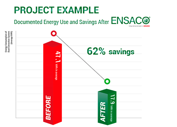 Oszczędzaj nawet do 80% energii zużywanej przez system odpylania dzięki systemowi sterowania ENSACO® oraz filtrom, wentylatorom i innym urządzeniom Moldow.